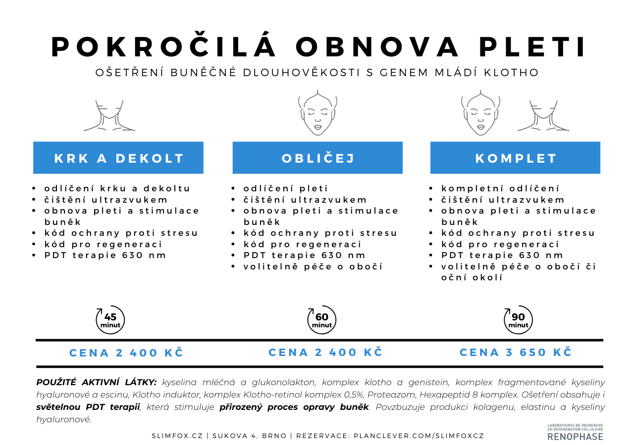 Základem ošetření buněčné dlouhověkosti je Klotho (aktivátor hormonu mládí): Klotho je aktivní látka s mnoha efekty – silný antioxidant, kontroluje přirozený intracelulární obranný mechanismus, chrání tedy buňky, reguluje proces stárnutí a podporuje lepší zdraví. Nicméně několik věděckých studií prokázalo, že hladina klotha je ovlivněna stresem a postupně klesá. Ošetření se skládá ze 4 kroků, které musí být zakončené světelnou terapií, u nás používáme PDT světlo. Výhodou ošetření je, že lze provádět celoročně. Výsledný efekt podpoříte používáním doporučené péče na den i noc.